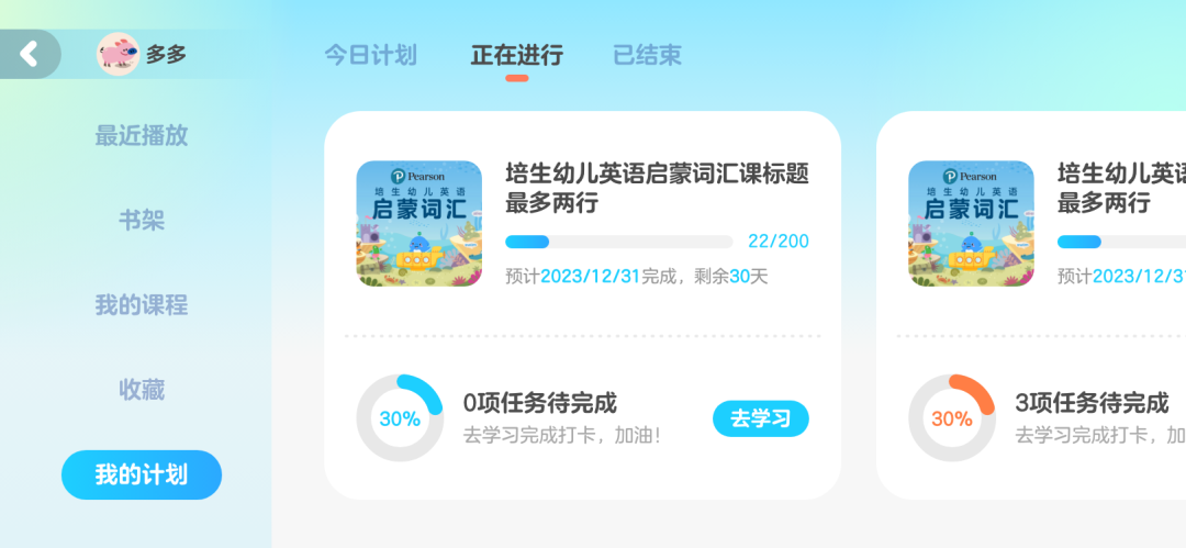 点进首页上方的书架,关于孩子最近在读什么、听什么,以及每日课程学习计划是否已按时打卡完成,家长都可以瞬间掌握。