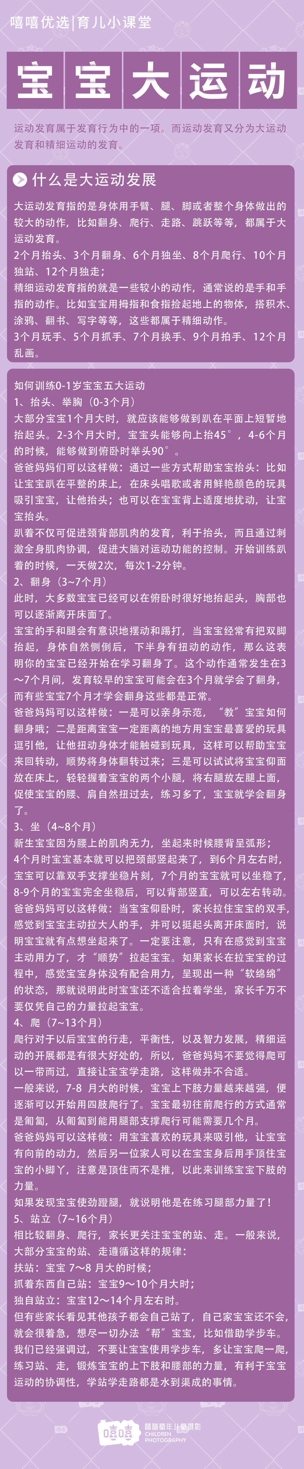 4、阶段性: 大动作的发展既有连续性,又有阶段性。阶段性指儿童每个动作的出现都有一定的时间范围。例如,我们常说:3翻、6坐、8爬,就是指这个动作出现的时间范围。一般儿童大概在3个月左右学会翻身,有的孩子稍微早一些,有的孩子稍微晚一些,总的来说3个月左右就是正常。6个月左右会坐,8个月左右会爬。只有当末个动作比平均值晚或早2个标准差,才算异常。
