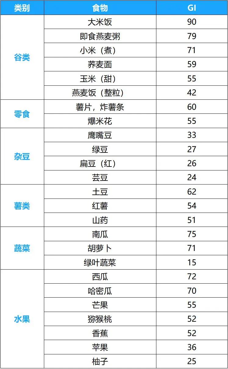 通常GI<55为低GI食物,GI介于55~70为中GI食物,GI>70为高GI食物。