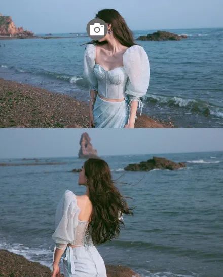 身着法式泡泡袖纱裙搭配微卷长发,在海天一线间温柔伫立,画面安静又美好