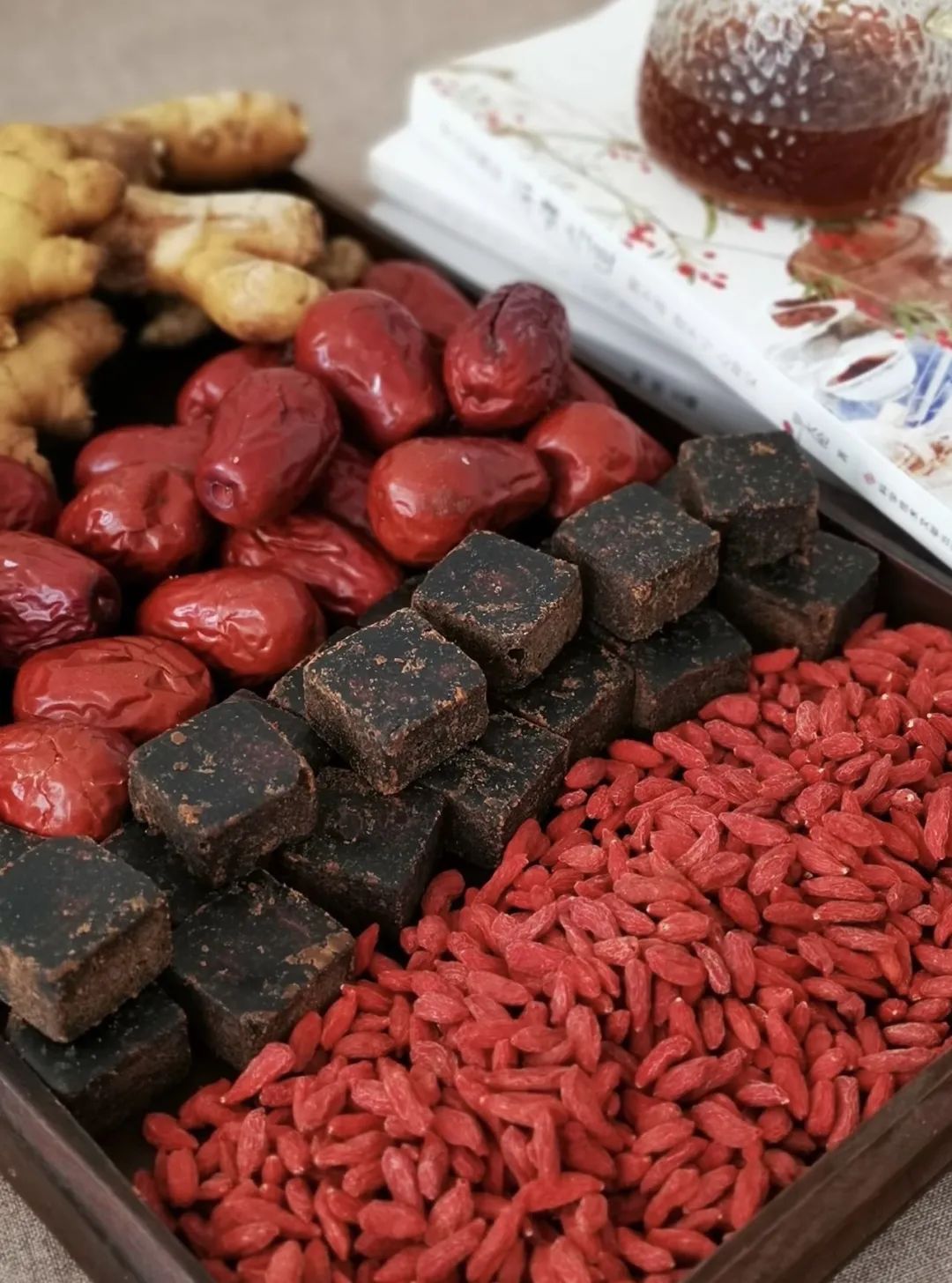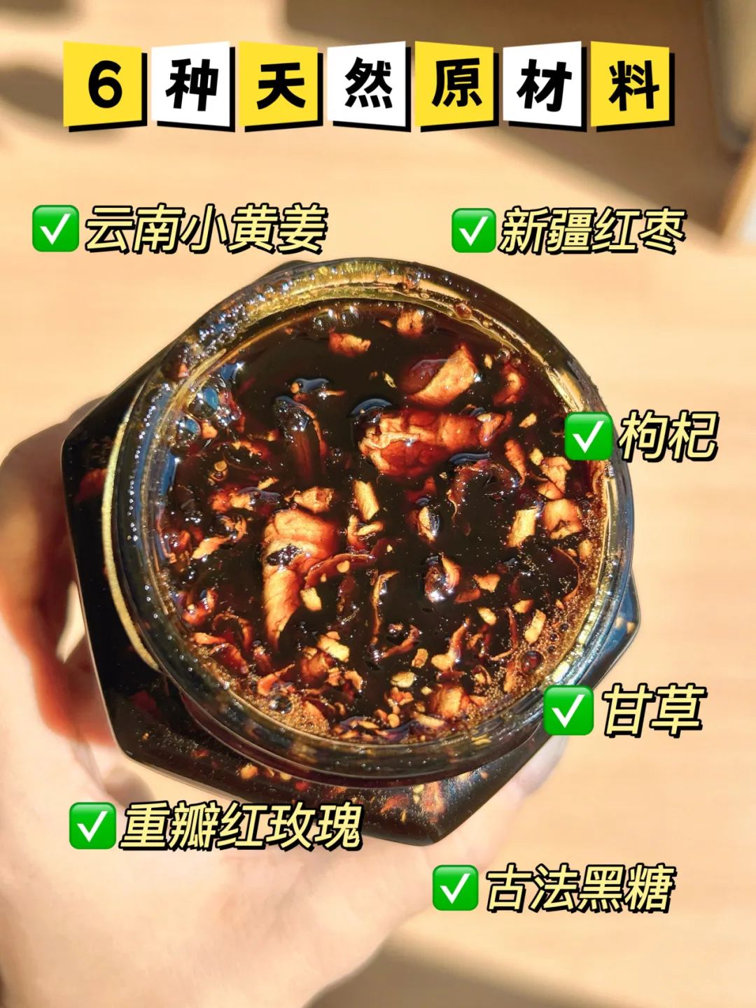 古法熬制传统黑糖,红甘蔗汁提炼,温而不火,特别搭配了枸杞和重瓣红玫瑰,中和小黄姜的温性!