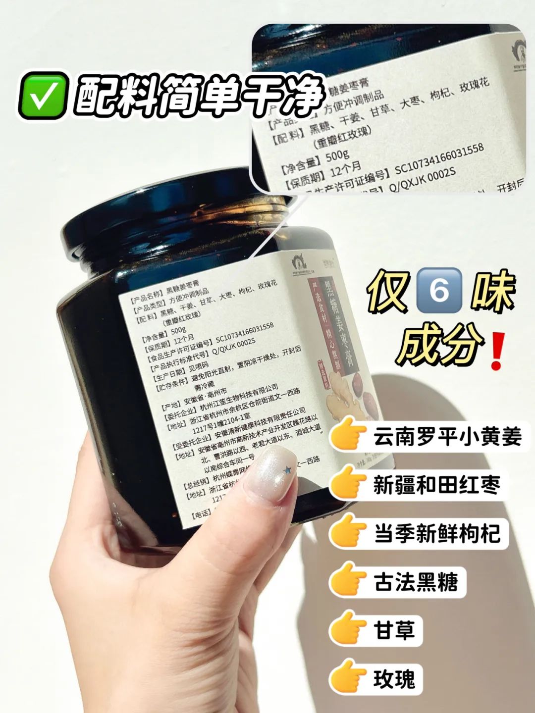 李时珍营养食光黑糖姜枣膏,配料表就像一股清流,只有黑糖、干姜、甘草、大枣、枸杞、玫瑰这6种食材