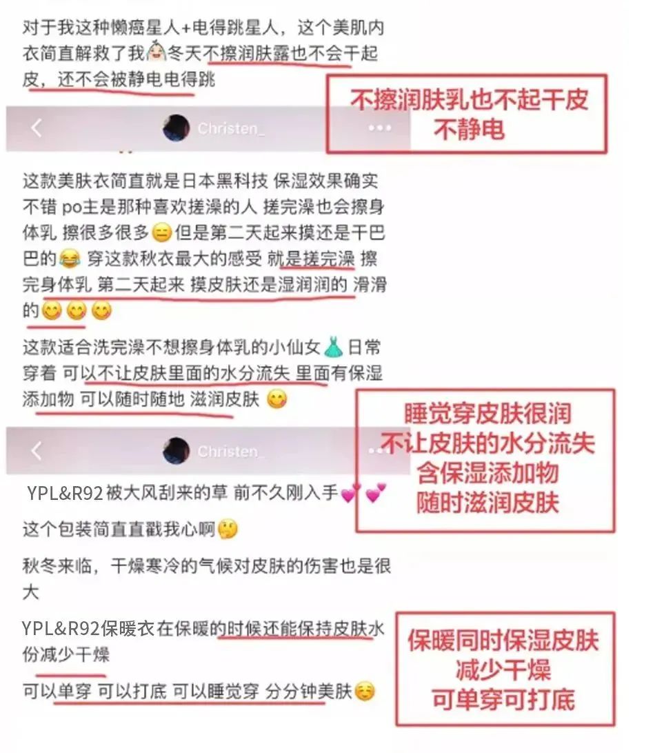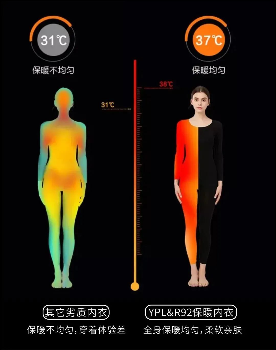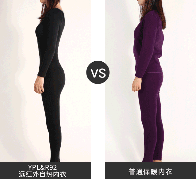 学生党和上班族穿她,外面搭一件卫衣或大毛衣就能出门,在教室或者办公室里温度刚刚好!冬天室外空气再冷风再大,穿上它,比穿2件羊毛衫还暖!保暖效果是其他保暖内衣的3倍以上!冬天很多女生皮肤缺水干燥,再加上保暖内衣穿得厚,闷湿不透气,很不舒服。YPL&R92保暖内衣利用意大利3D高密度立体编织技术,棉纱数量细密,能让衣服整体更加透气保暖。我们将熨斗放在内衣上,可以看到大量的水汽能够穿透面料,透气性真是杠杠的,堪称是“会呼吸”的面料!为了摆脱恼人的小火星,防止“炸毛”穿脱被电!YPL&R92保暖衣采用了抗静电处理,消灭冬天噼里啪啦的毛躁感。YPL&R92保暖衣贴心。可以达到肌肤表层锁水和补水的功效。穿上去就感觉皮肤被滋润的感觉,用来缓解秋冬季的干燥不适,简直是全身的一个护肤补水体验。懒得擦身体乳的姐妹,要入这款带美肤功能的保暖内衣!养出Q弹肌~更贴心的是,衣服的胸口和裤子侧边处都印有一个日系logo,会随着温度的变化改变颜色,随时提醒你添衣保暖。温度升高时,这个日系风满满的logo会由紫色变成粉色,黑科技十足,隐藏的拉风~可以说,YPL&R92不止是一套御寒的保暖衣,还是一套收腹裤+塑身衣。采用包裹织法设计,不带钢圈却能有效承托胸部、收紧腰臀赘肉,穿上它立刻视觉显瘦10斤!和皮肤无缝贴合,没有灌风的可能性,再去穿一些宽松的毛衣就不会觉得背后冷飕飕啦!完全不会显胖显肿!勾出美好身材!即使有小肚腩,穿上后也能稳稳藏住,就算在外面穿一条紧身牛仔裤也完全看不出里面穿了一件保暖内衣。弹性非常好的面料,所以尽管是均码,却装得下各种身材,40-80Kg的女士都适合,让胖子和瘦子都过个温暖的冬天。