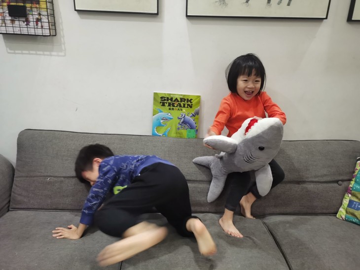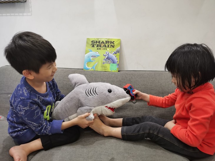 读完后两人还“砰砰啪啪”地从玩具袋里翻出鲨鱼玩偶和托马斯小火车。
