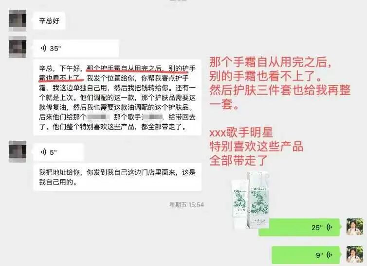 柅友:“那个护手霜自从用完之后,别的护手霜也看不上了。上次买的护手霜和修护油,被xxx明星全部带走了,他们特别喜欢这些产品。我把地址给你,你发到我自己这边门店里面来,这是我自己用的。
