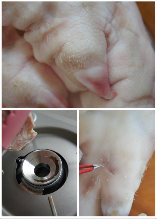 2、猪蹄用火烧一下,去掉黑色部分,焯水使猪蹄紧缩,再次去掉猪毛;