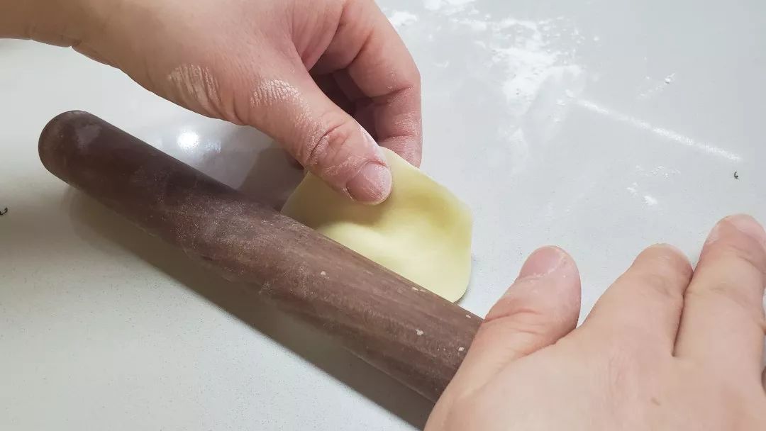 2、面团分剂子,每个约12g,擀面杖擀制面皮,直径约10cm,在面皮1/3处放入馅料,新手可少量添加