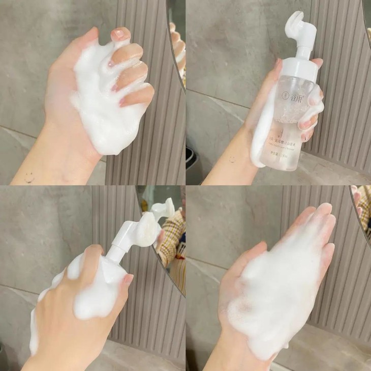 6、瓶身上有一个起泡泵,轻轻一按,可以按出大量绵密的泡沫,更有助于清洁面部,使用感也很好。