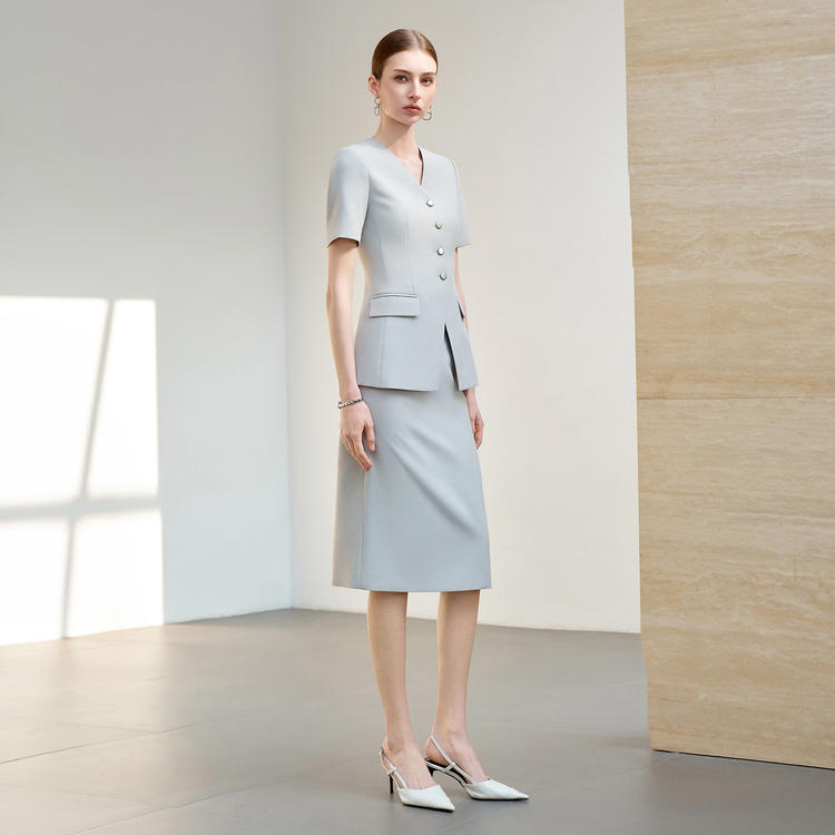 专为职场女性打造的羽灰色西装套裙,用克制温柔的色调与考究细节,平衡专业气场与优雅质感,是商务场合不出错的 “体面选择”