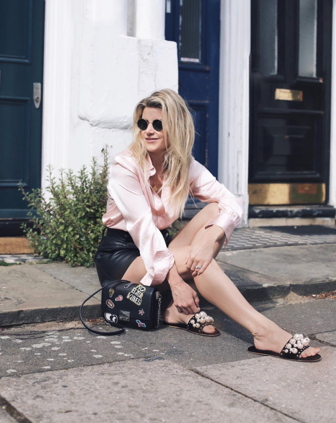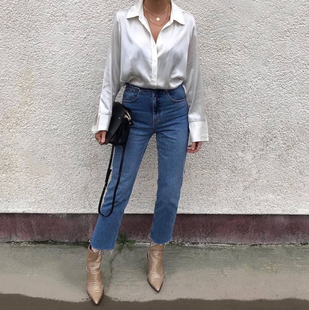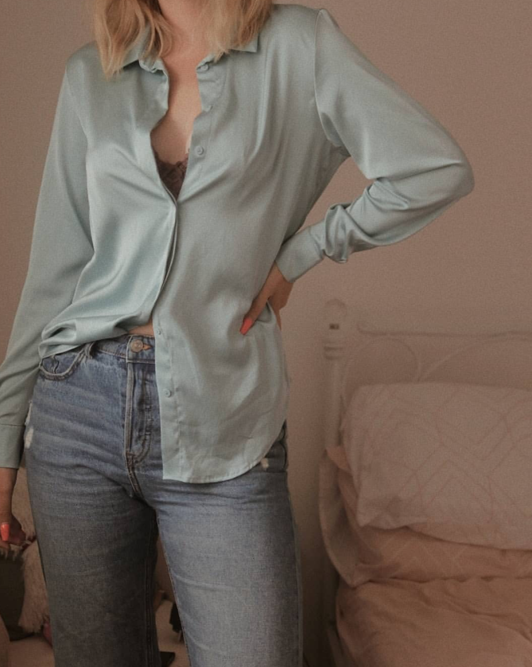 不少时尚博主都喜欢把衬衫的扣子多解掉一颗,露出迷人的锁骨。隐隐可见的蕾丝内衣,为全身的穿搭,都增添了一丝高级的风情。