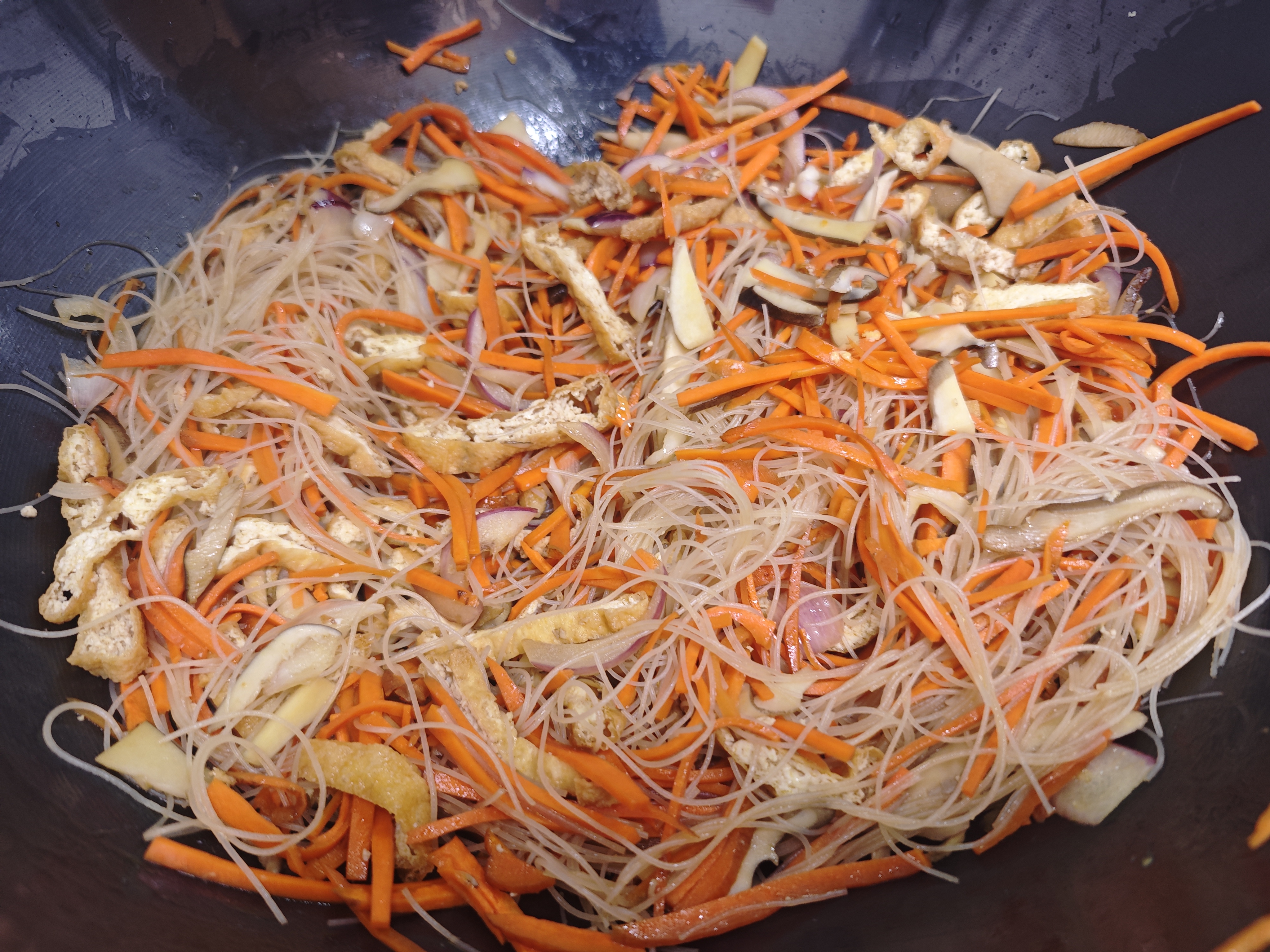 先下锅炒熟鸡蛋、蘑菇和豆腐片丝,再加入胡萝卜丝和洋葱丝,炒到断生就可以放入预拌好的米粉