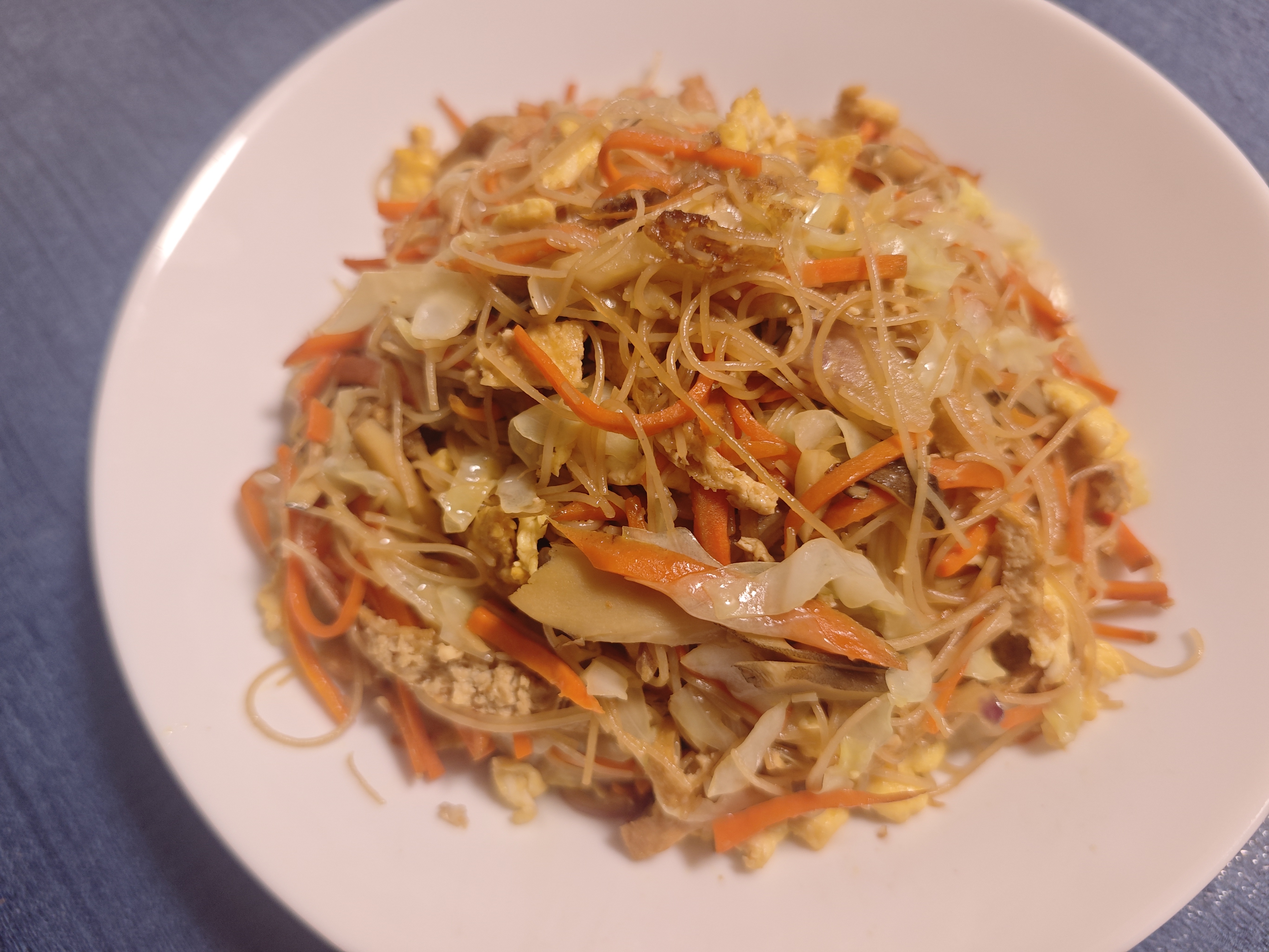 配料:鸡蛋、鲍鱼菇、豆腐片切丝、胡萝卜、洋葱丝、圆白菜丝