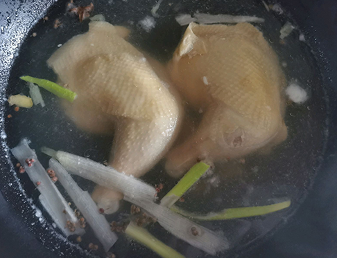 准备一锅水,放入葱,姜,水烧开后放入鸡腿,大火烧开改成小火炖煮20分钟,然后放入1勺盐,尝一下汤是否有咸口,如果有咸口关火放到自然凉;