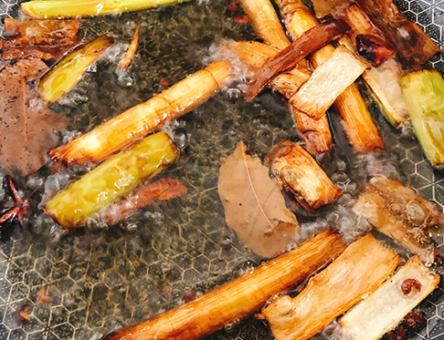 锅里倒入1小碗油(吃饭小碗),放入蒜片,姜片,葱段,1根香菜,1个大料,大火烧冒泡后改成小火㸆到香菜,大葱变成灰色,把里面的食材都拣出去,油起烟后关火;