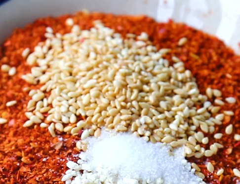 锅里放点油,放入干辣椒,用铲子反复翻炒,炒到有些糊,然后取出来晾凉,去掉辣椒蒂,放到菜板上,用擀面杖压,用刀剁成辣椒面,放入2指2捏盐,1勺芝麻(喝汤匙勺);