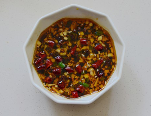 红油汁:1平勺白糖,1平勺芝麻酱,1平勺蒜末,1平勺葱花(葱白),5勺酱油,2勺陈醋,3指1小捏盐搅拌,搅到芝麻酱完全泄开,加入5勺矿泉水搅拌均匀,放入红油(红油的量是汁的量的一半),1勺麻油搅匀,放入冰箱冷藏;