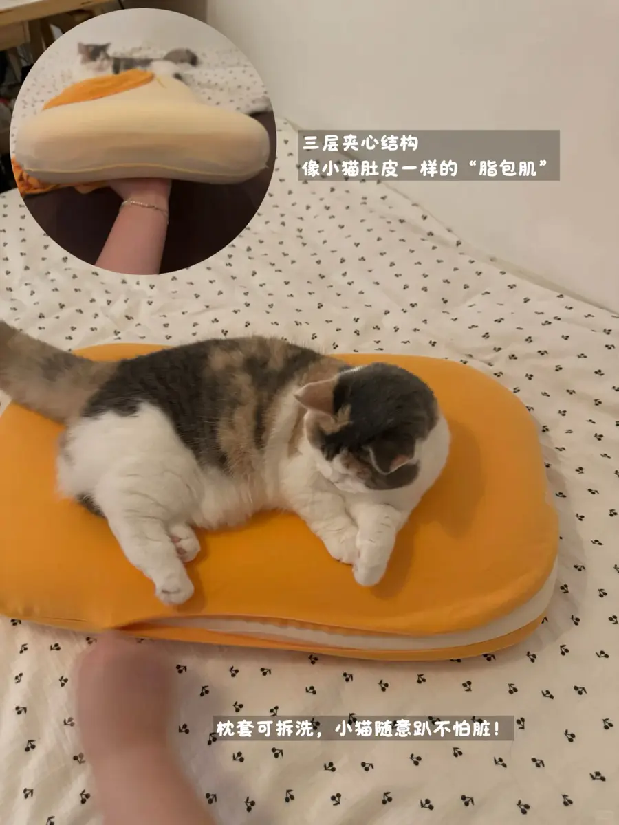 一打开包装就映入眼帘的猫肚皮自我介绍,三层夹心结构的猫肚皮枕在结构上也像小猫的肚皮一样是脂包肌,真正做到了外软内撑。