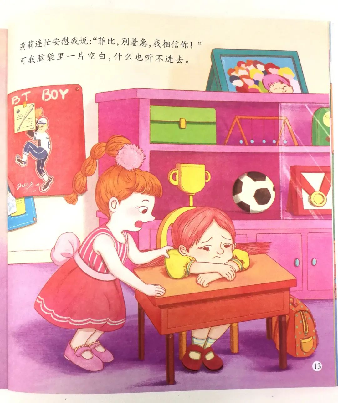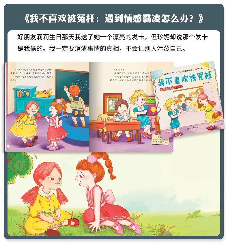 以《我不喜欢被冤枉》为例,菲比同学在班上总被珍妮欺负,好朋友莉莉在她过生日那天,送了她一个漂亮的蝴蝶结,但珍妮却说是她的……