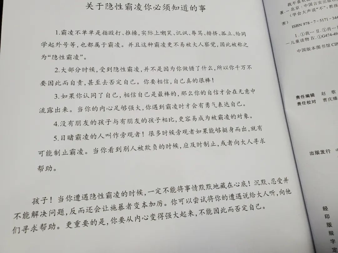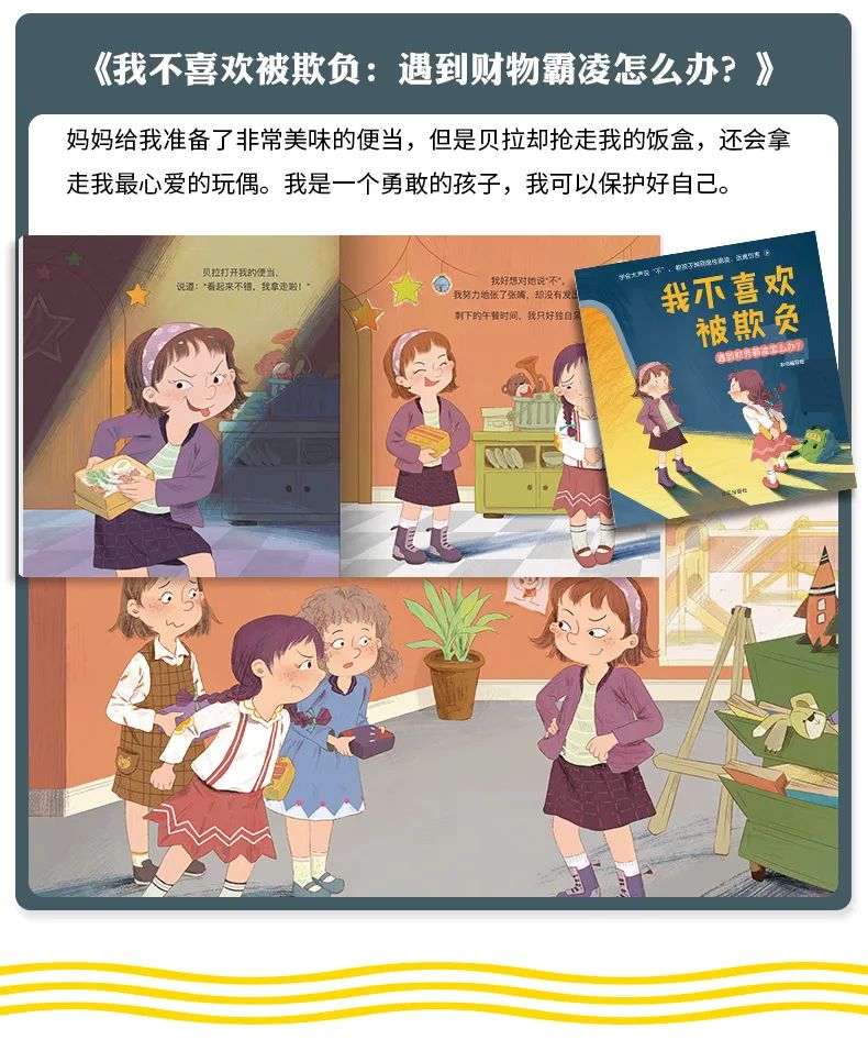 这套书最重要的就是教会孩子事先要识别“霸凌”并且反对“霸凌”。比如被乱摸、被抢夺、被嘲笑、被排挤等等行为。做到不被别人欺负也不去欺负别人!成为一个内心强大勇敢正直的好孩子!
