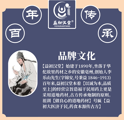 【益初汉堂】始建于1890年,坐落于华佗故里药材之乡的安徽亳州,创始人李乐山先生(字锦安,号秉益 1846~1913)百年来,益初汉堂本着【以诚为本,品质至上]的经营宗旨造福干民用药上更是采用道地药材,古方传承炮制的原则。祖训【做良心的道地药材】号匾【益初大医济于民,药食本源传古方】