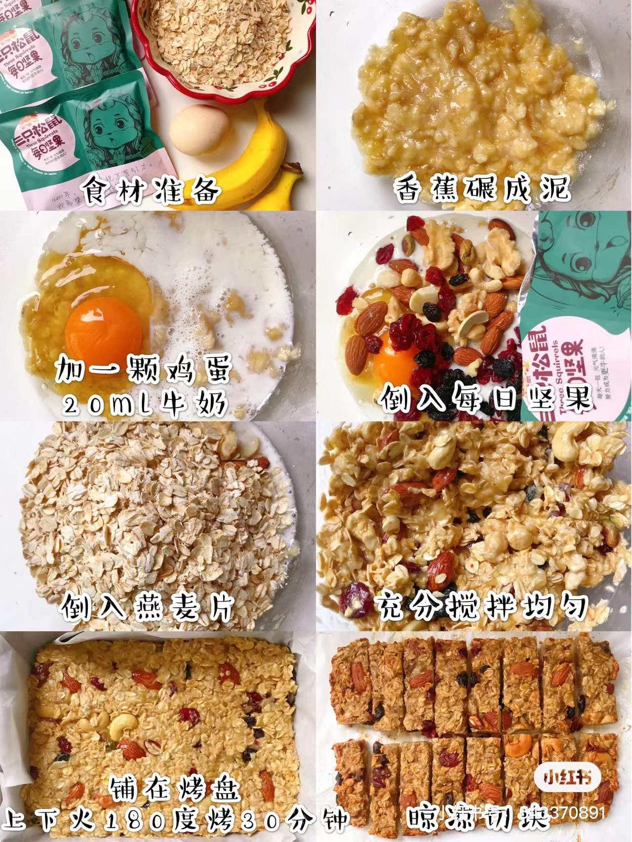 1、香蕉碾成泥,加入一颗鸡蛋,20ml牛奶,倒入3袋三只松鼠每日坚果,再倒入燕麦片,搅拌均匀