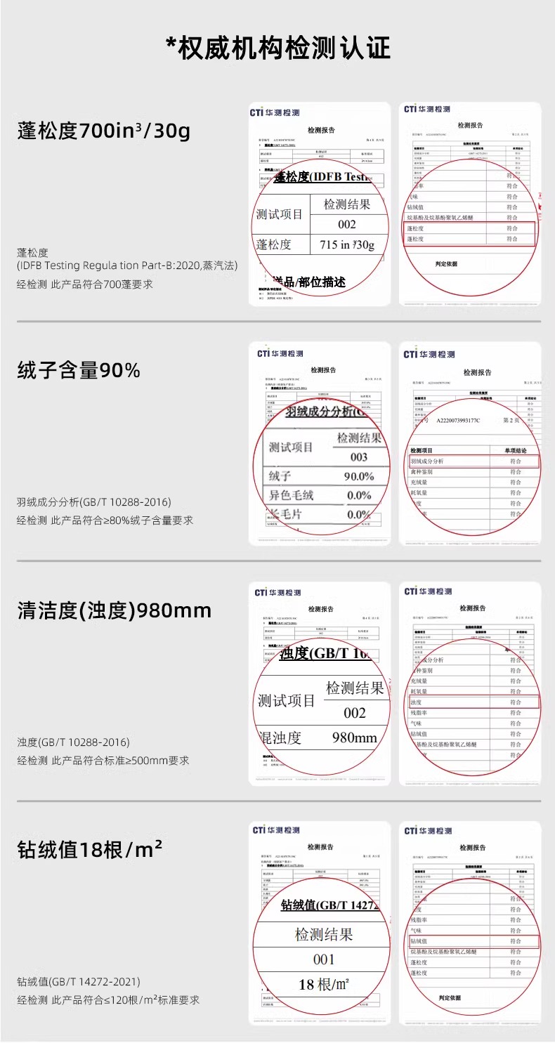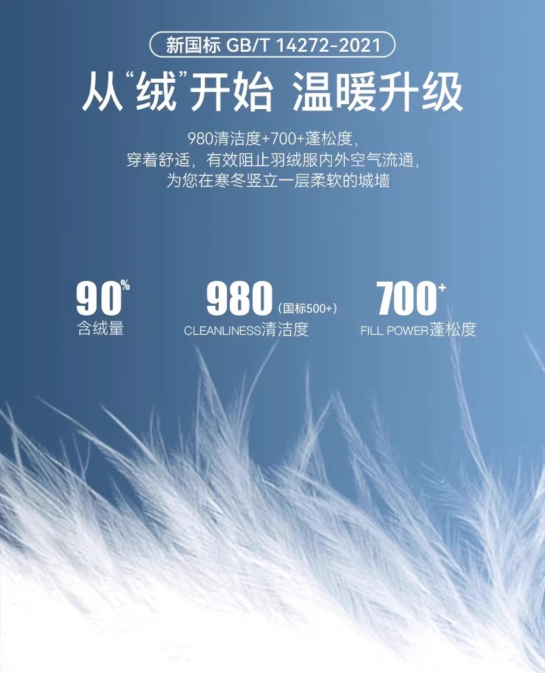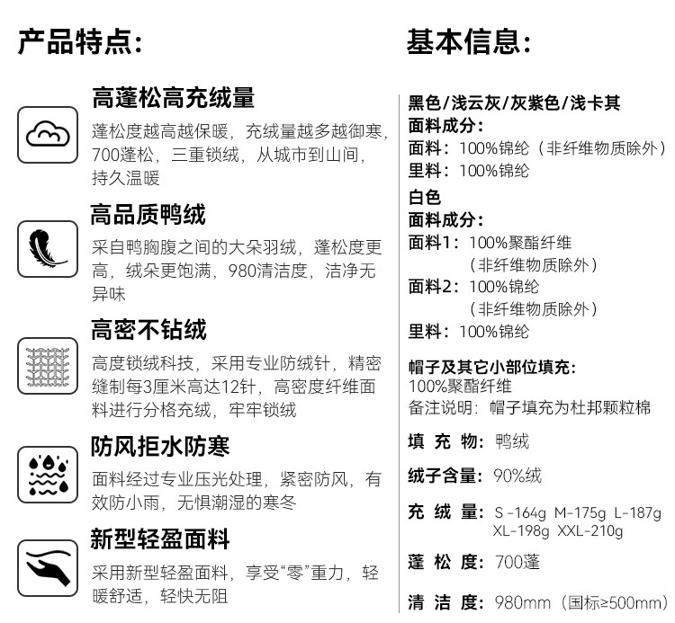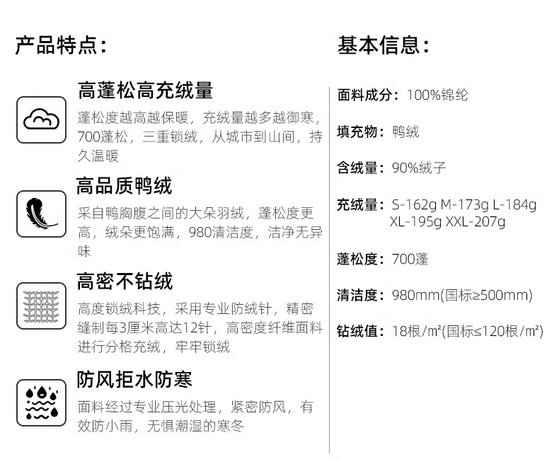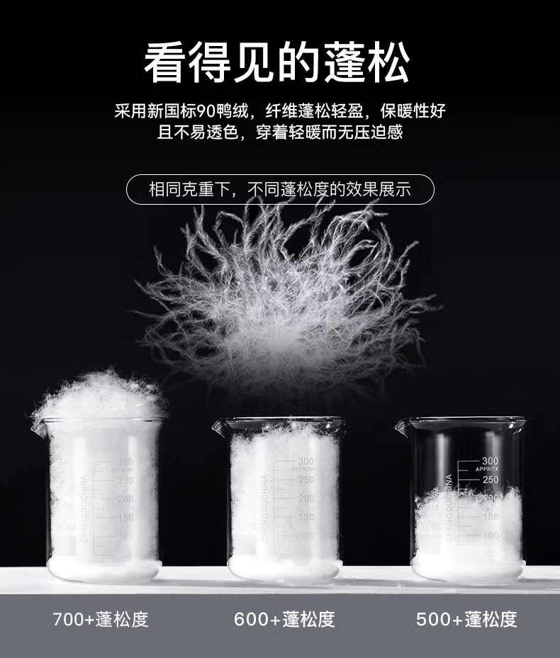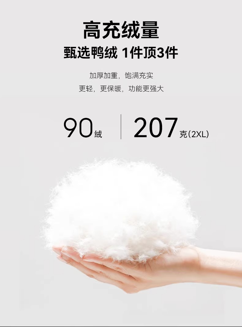 700FP 高蓬松,超国标,同重量保暖体积!高充绒量,XL 码 195 g 90% 鸭胸腹绒(绒朵大、饱满)。