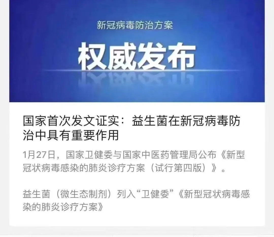 今年年初,国家卫健委也已经证实了益生菌在新冠病毒防治中的重要作用,用于解决患者肠道菌群紊乱问题。