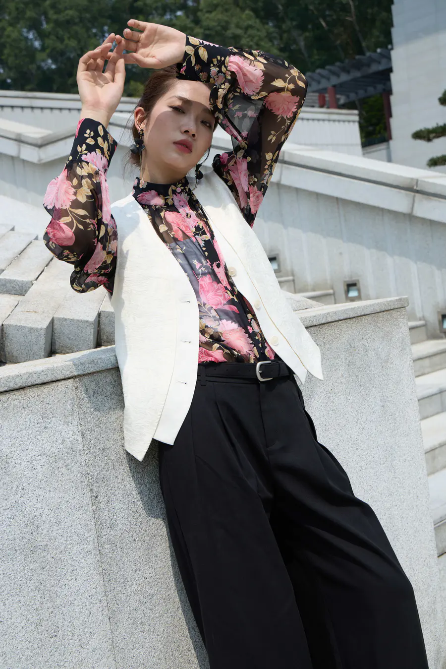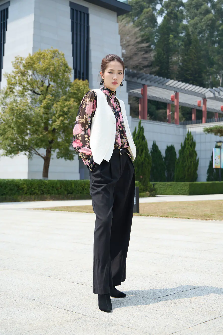 踱步艺术回廊 白麻马甲双叠门襟写意「留白」 粉菊衬衣高领灯笼袖晕染诗意 阔腿裤以建筑褶裥勾勒步履韵律 珍珠排扣与包布工艺藏东方密码 于针脚间绣出含蓄的奢华叙事