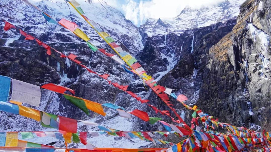 面对俊冷的雪山与冰川,走在挂满经幡的道路上