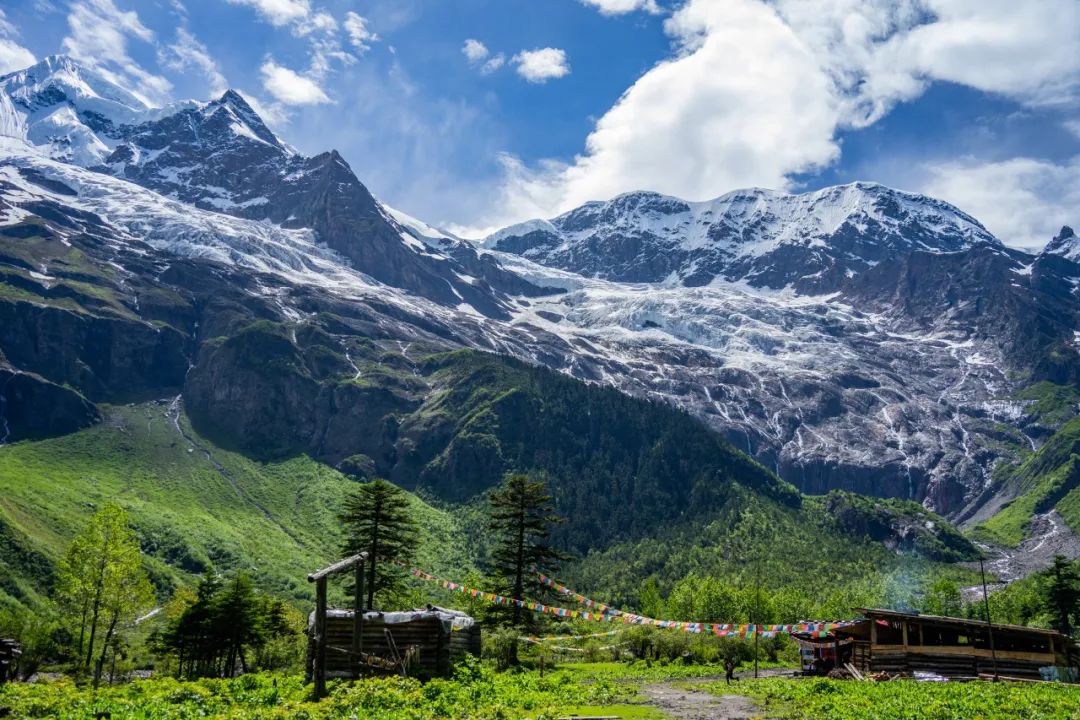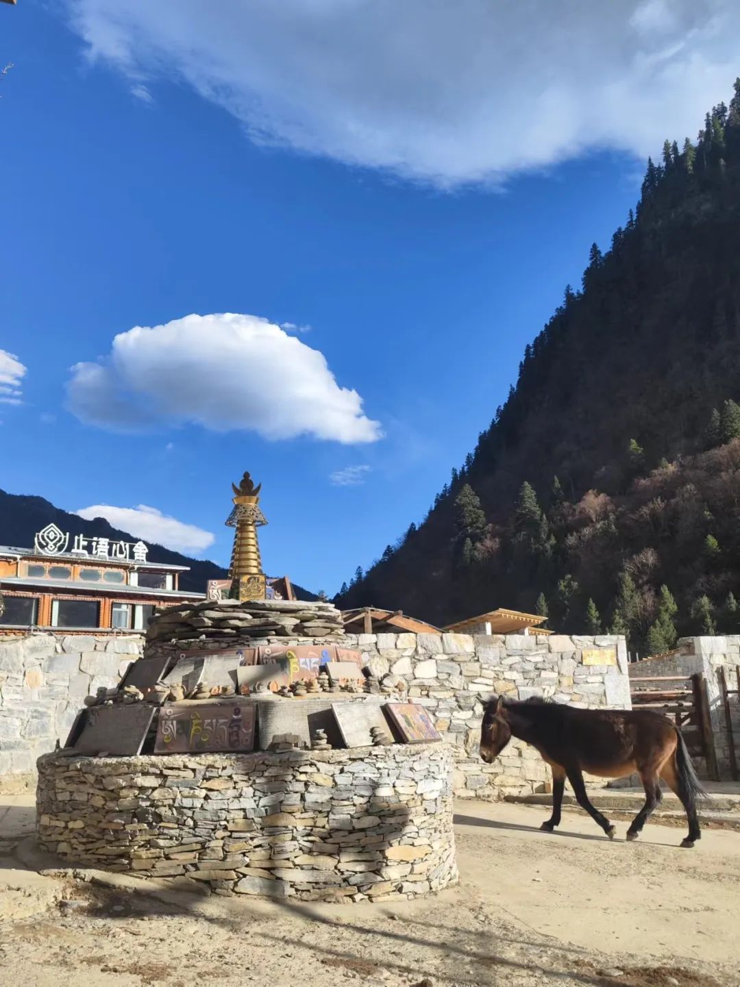当穿过最后一片原始林后,就终于到达了下雨崩村。趁着天色还亮,完全可以在这里歇歇脚,看看远处的雪山,和路过的牛群打个招呼,享受一下藏区的暖阳。