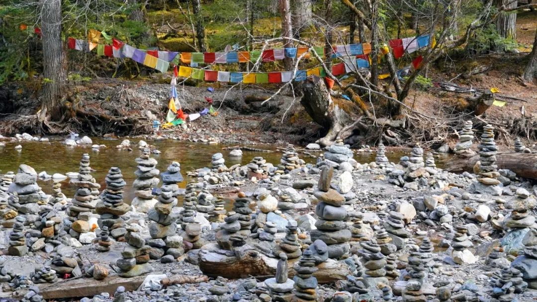 与咔咔穿林子、走土路、爬雪坡的冰湖线不同,神瀑线更像是一场面对雪山的朝圣。只要穿过原始森林,眼前就豁然开朗了。在前往神瀑的路上,还会遇到莲花生大师的脚印石头。