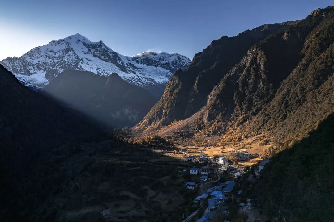 时光流转,世界变化万千,但雨崩却保持着她应有的节律。3月初,卡瓦格博迎来春季,河谷中的桃花和油菜花开的灿烂;5月后,紫色和粉色的杜鹃花开满山头;7、8月的夏季,包裹着雨崩的山上会染上油油的绿色。9、10月,则是满山的金黄。而漫长的冬季,又正是看日照金山的好时节。
