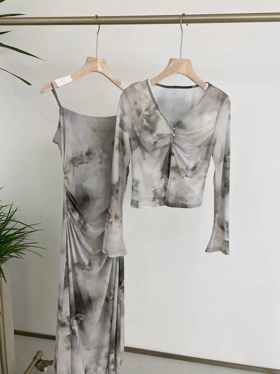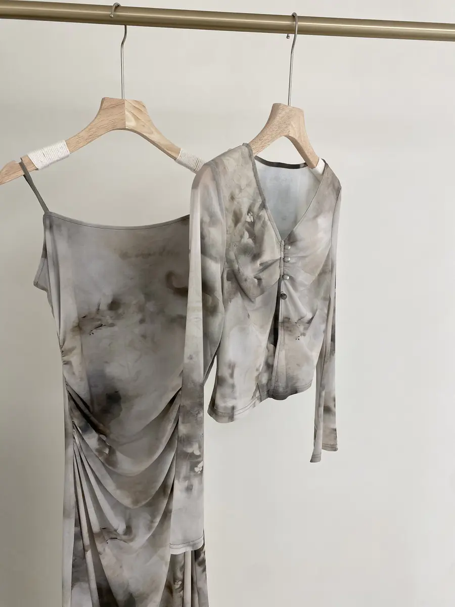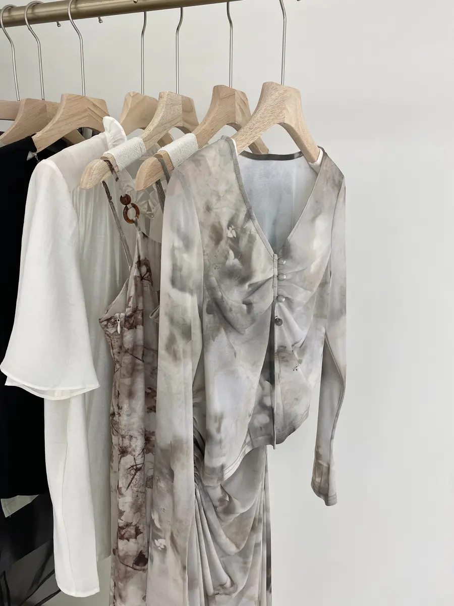 结合网纱材质,更加柔美错落,半透+褶皱营造的堆叠感,使得印花美的更有层次~