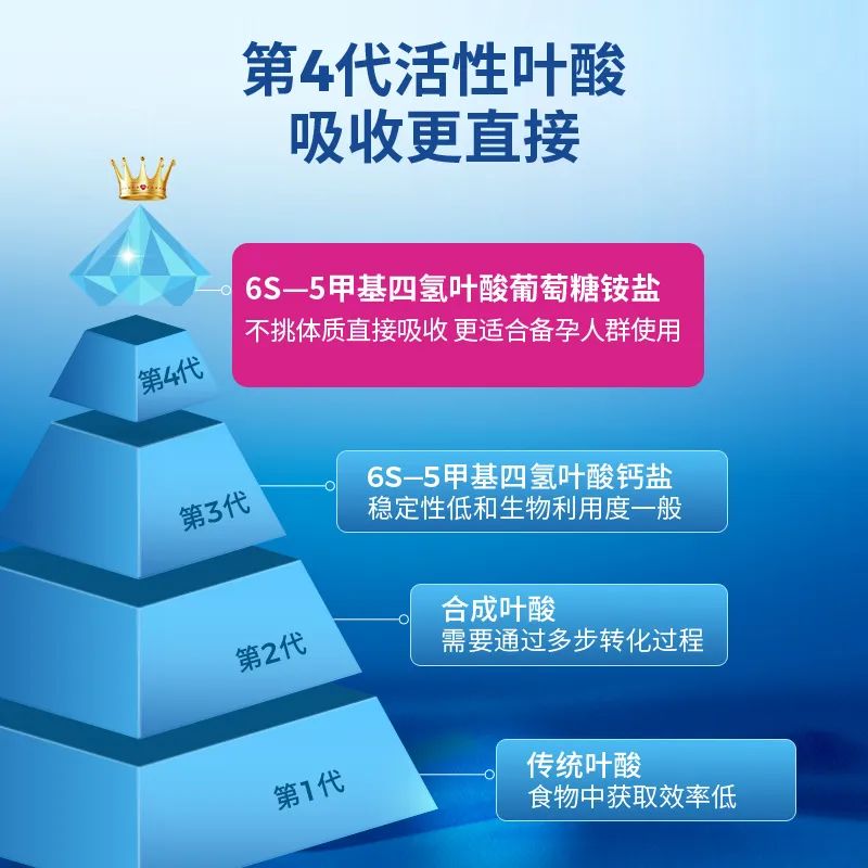 如果姐妹存在叶酸代谢障碍问题,推荐选择活性叶酸哦!活性叶酸可以跨过叶酸代谢障碍直接被吸收!尤其是第4代活性叶酸,具有更高的生物利用率,也是目前的主流选择。