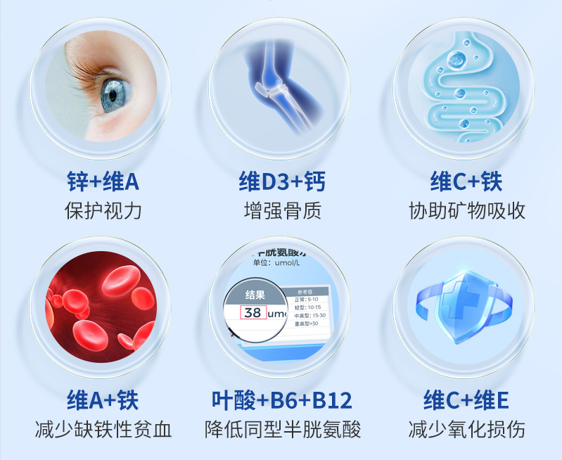 例如维生素B6、B12和活性叶酸搭配,有助于支持胎儿早期发育,降低神经管缺陷的风险;锌和维生素A搭配有助于保护胎儿的视力发育;维生素A和铁搭配,可以帮助孕妈改善贫血,提升气色等。