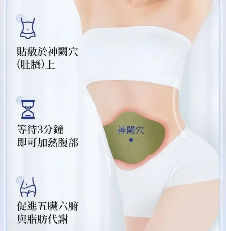 每天洗完澡或清洁肚脐部位后,贴敷于肚脐表面,热量逐渐扩散全身,赶跑湿气。