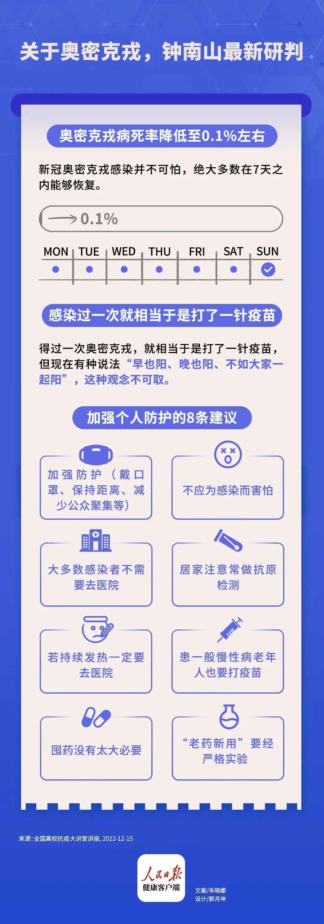 钟南山院士在演讲中提到,众多数据显示,奥密克戎传播性增强,致病力明显减弱,病死率降低至0.1%左右。奥密克戎(BA.4/5, BF.7)感染不可怕,绝大多数可在7-10天恢复。自己的孙女感染3天后恢复。