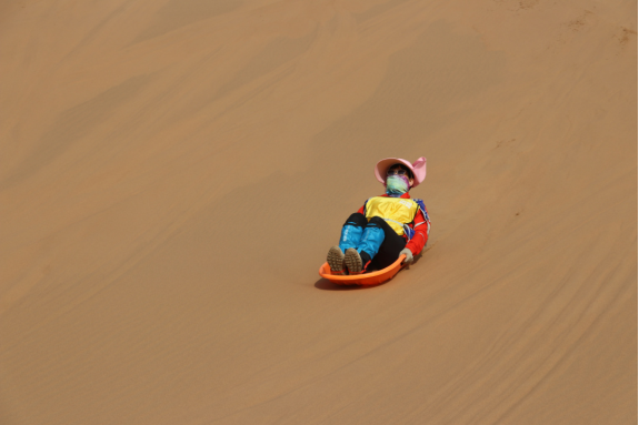 ● 行进过程中不可急于向前,上坡时双脚成外八字登沙山,下坡时脚后跟用力踩住沙子。
