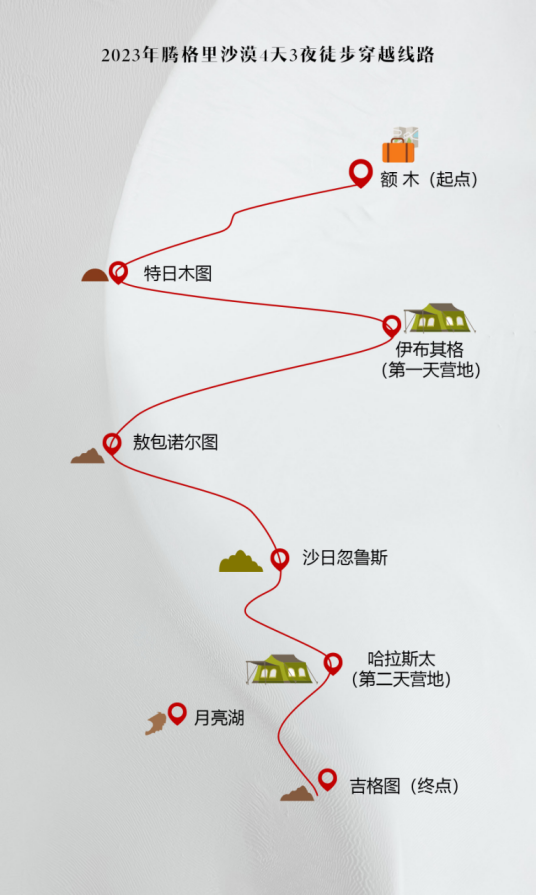 餐饮:沙漠徒步三天营养路餐、瓶装饮用水、功能饮料、时令果蔬、沙漠营地2早2晚餐(后附清单)
