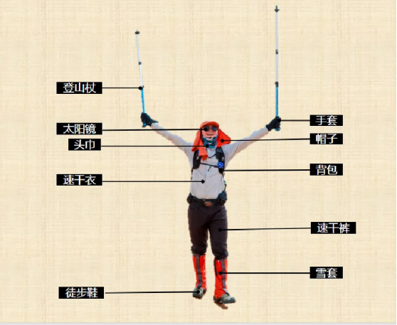 ● 个人装备提前一定要做好准备,尽量不穿新鞋带网眼的运动鞋,衣服要速干,尤其内衣也要速干。