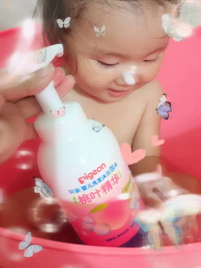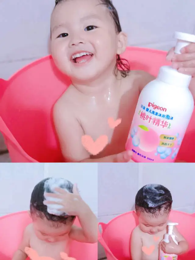 这时候拿出我们的洗澡神器~👍桃叶精华洗护二合一,粉粉嫩嫩的包装,绵密软糯的泡沫,香香甜甜的味道,很难不爱呢🚿我们以前只爱洗澡,很不爱洗头发,总是说迷眼睛👀,每次洗个头都跟打仗一样,先哄后吼