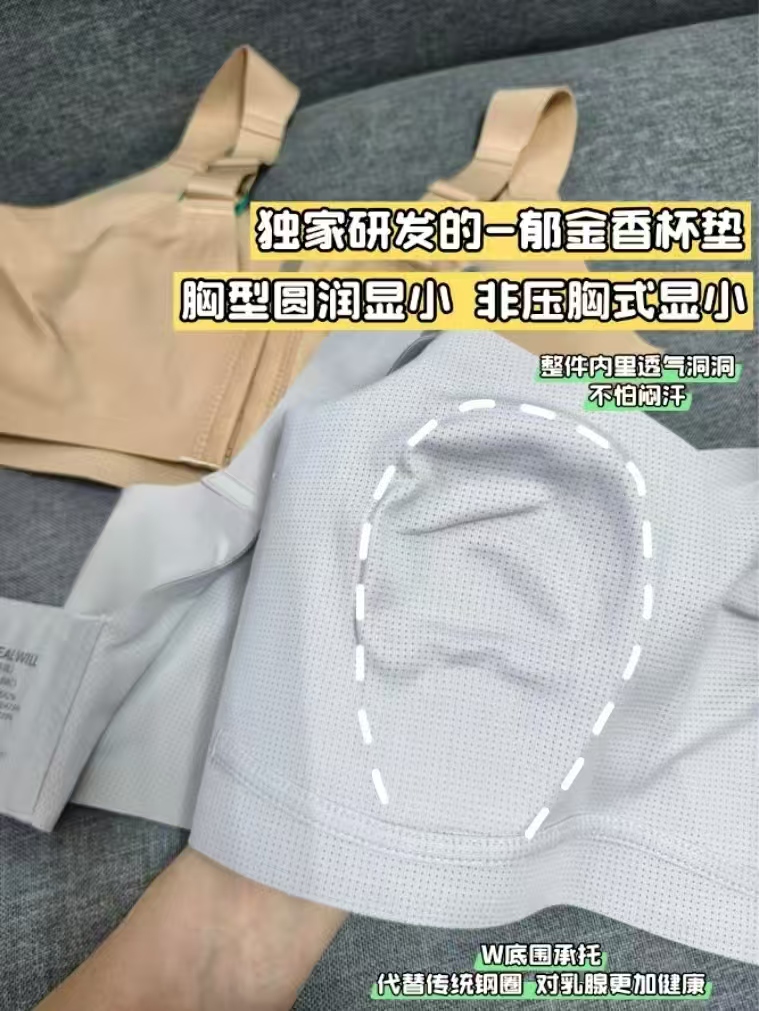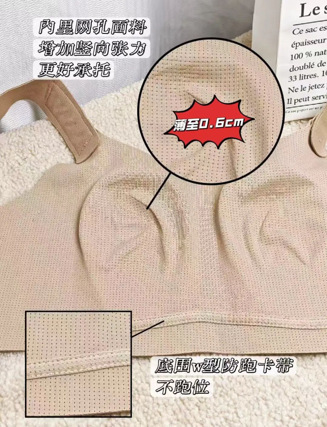 仅0.6cm的厚度透气杯不厚重也不凸点,穿着显小不塌还舒服!!下摆W型防跑卡带!能很好地稳托部~穿着跑啊跳啊也不会滑落,这内衣不仅能让大胸显小还能圆润提拉!整个体态都变好了!
