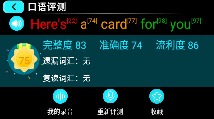 在联网状态下,学生可通过学习笔的【口语测评】功能进行发音测评,随时随地进行口语训练,跟读评分,提高口语能力。