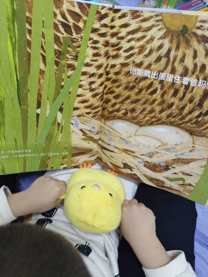 阅读《猜猜蛋里住着谁》时,弟弟抱起了小鸡球球,他说小鸡球球也是蛋宝宝,所以它可以一起阅读这本书。