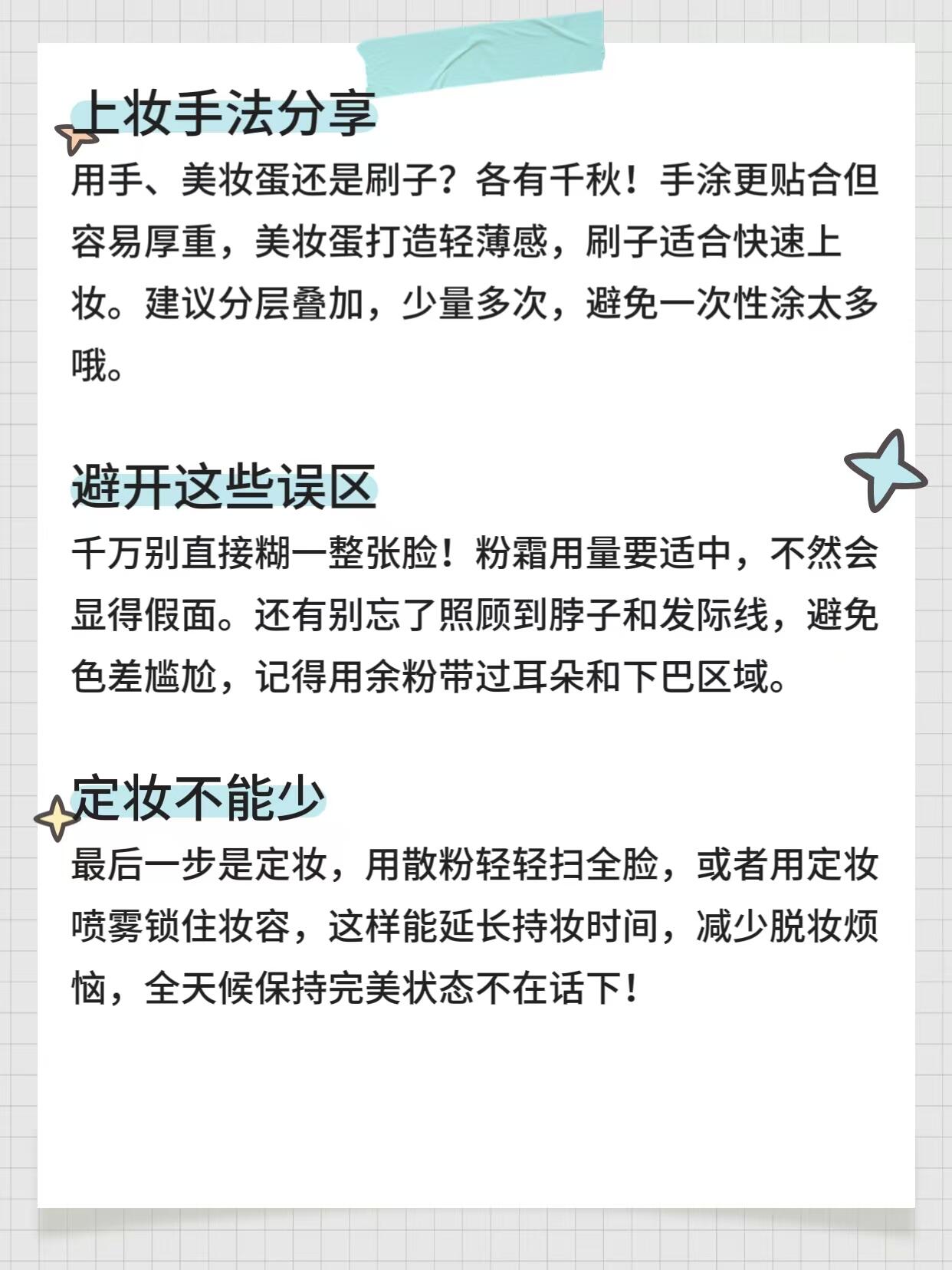 用手、美妆蛋还是刷子?各有优势🙌手涂更贴合但易厚重,美妆蛋能打造轻薄感,刷子适合快速上妆。建议分层叠加,少量多次,别一次涂太多~
