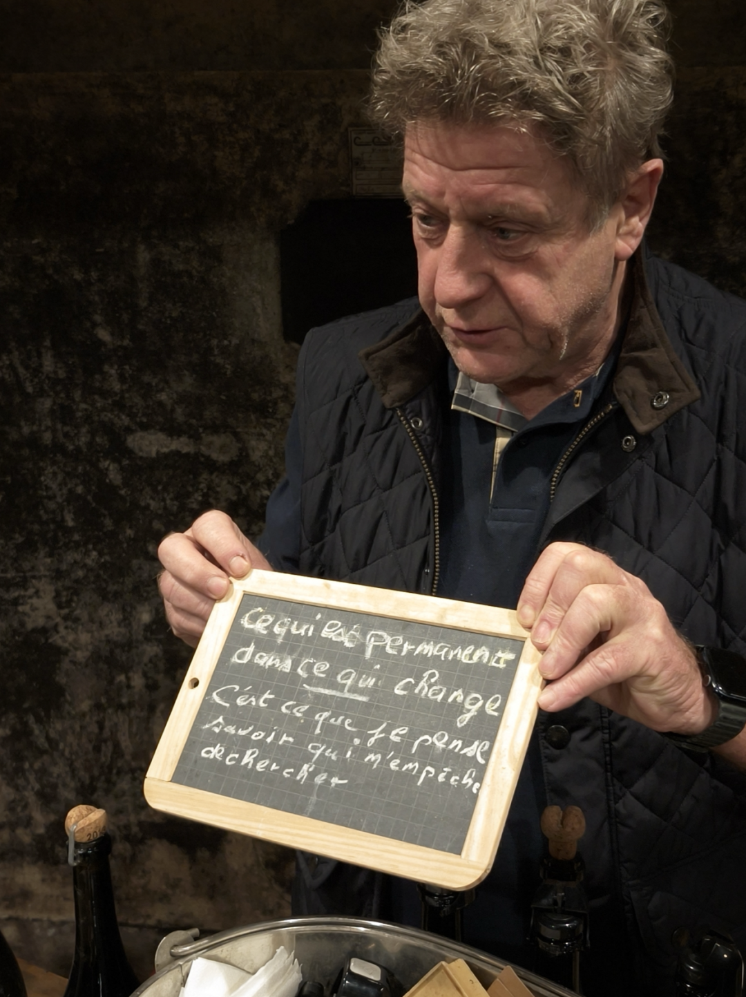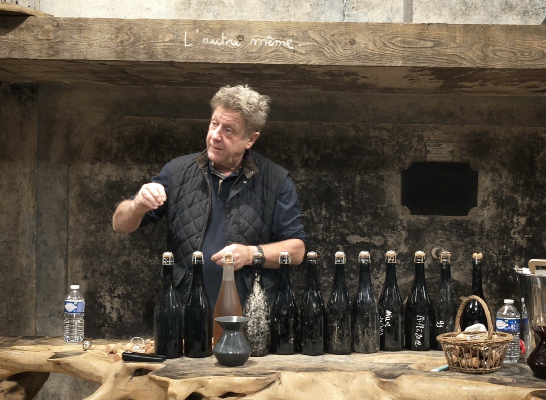 站在酒窖内,木质调香气、霉菌和氧气交织成独特的气息,仿佛带着时间的印记。没有传统品鉴座位,墙壁上的霉菌和蜘蛛网,这些自然的痕迹恰恰体现了庄主对自然的尊重与理解。酿酒之外,Anselme Selosse 对哲学思考更深入人心,他还与大家分享如何持续思考、探索、感知、保持好奇心,以及如何在全球化的世界中保持对本土文化的珍视与理解。这不仅仅是对香槟的思考,更是一场关于生活与哲学的深刻对话。