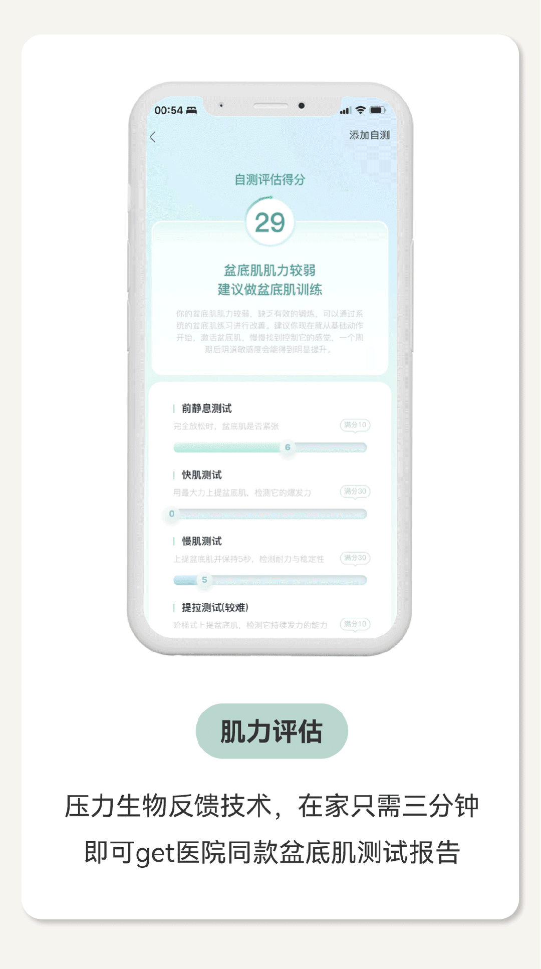 信号会回传到APP,由APP对这个信号进行分析,只需要3分钟,就能得出一份专业的盆底肌检测报告。