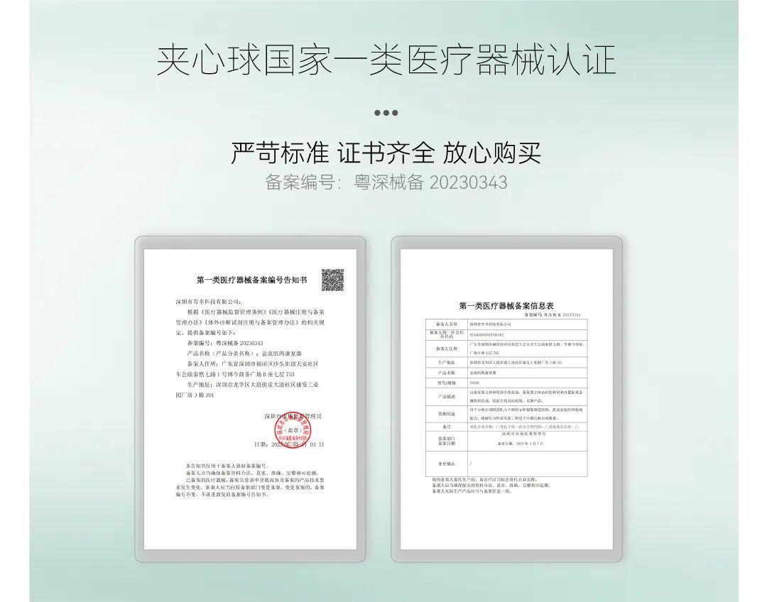 比如女生关心的材质问题,夹心豆已经获得了I 类医疗器械资质,国家权威认证: