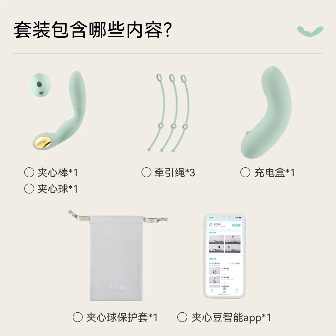 夹心豆套装,由一支训练主机(夹心棒)+一个阴道哑铃(夹心球)+APP组成。夹心棒除了训练还能当情趣震动棒使用(详细的用法后面会给大家介绍~)