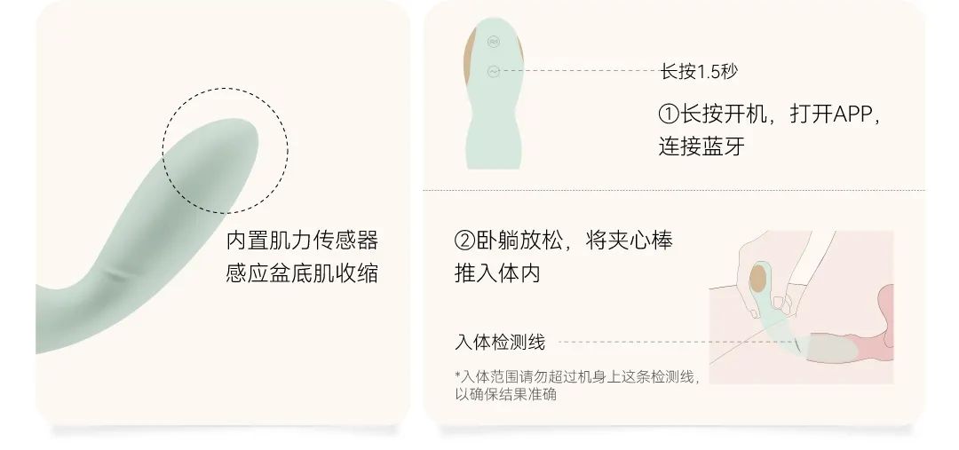 先把夹心棒放进身体,打开APP跟着指令收缩-放松盆底肌,控制小球上升下降,传感器会把信号传回来,你可以随时看到自己的发力状态。